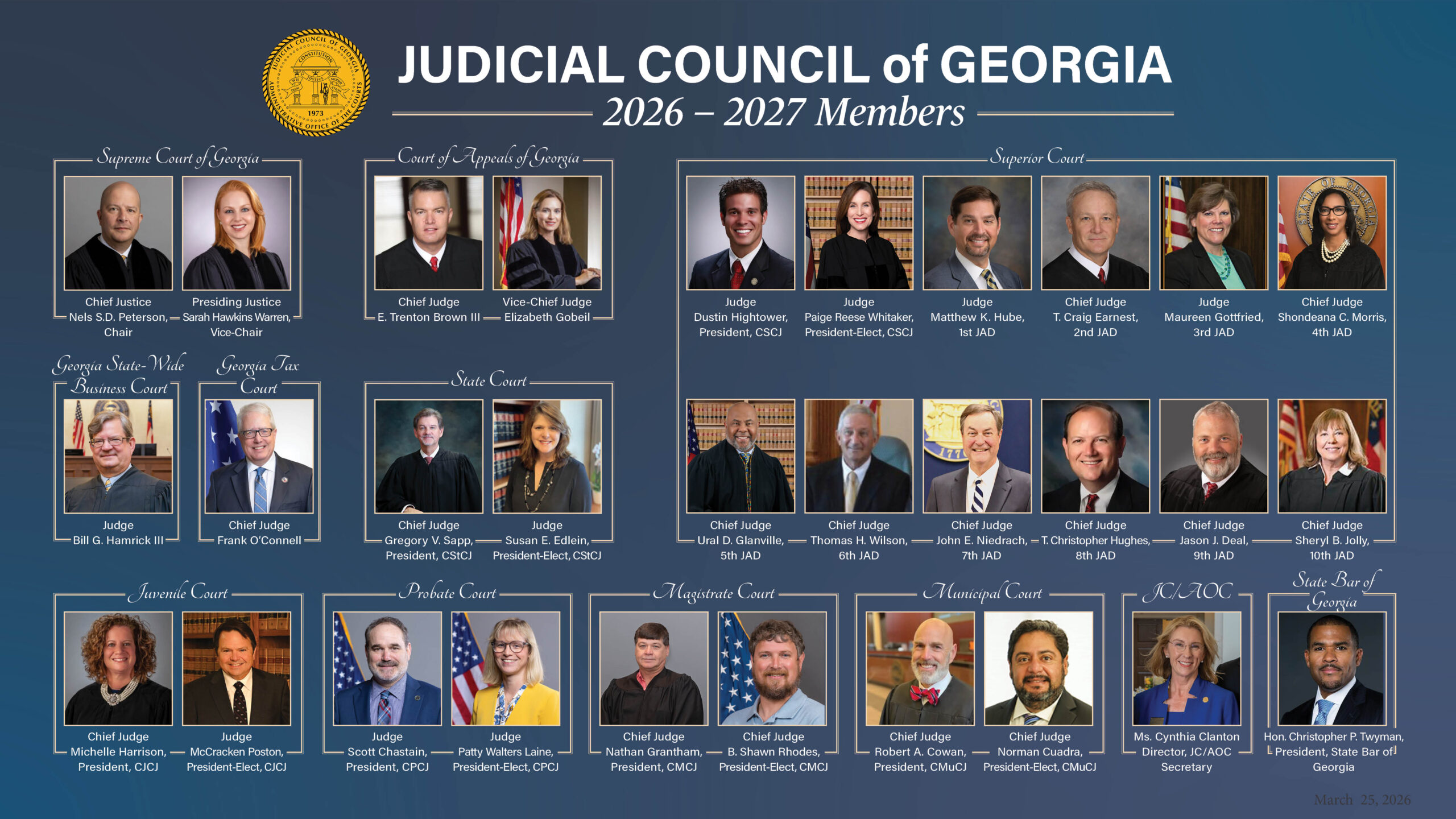 The Judicial Council of Georgia was created in 1945 and serves as the policymaking body for Georgia’s judiciary. The Administrative Office of the Courts (AOC) was created in 1973. As staff to the Judicial Council, the AOC provides subject-matter expertise on policy, court innovation, legislation, and court administration to all Georgia courts. The AOC also furnishes information technology, budget, and financial services to the judicial branch. The AOC is also led by Cynthia Clanton.